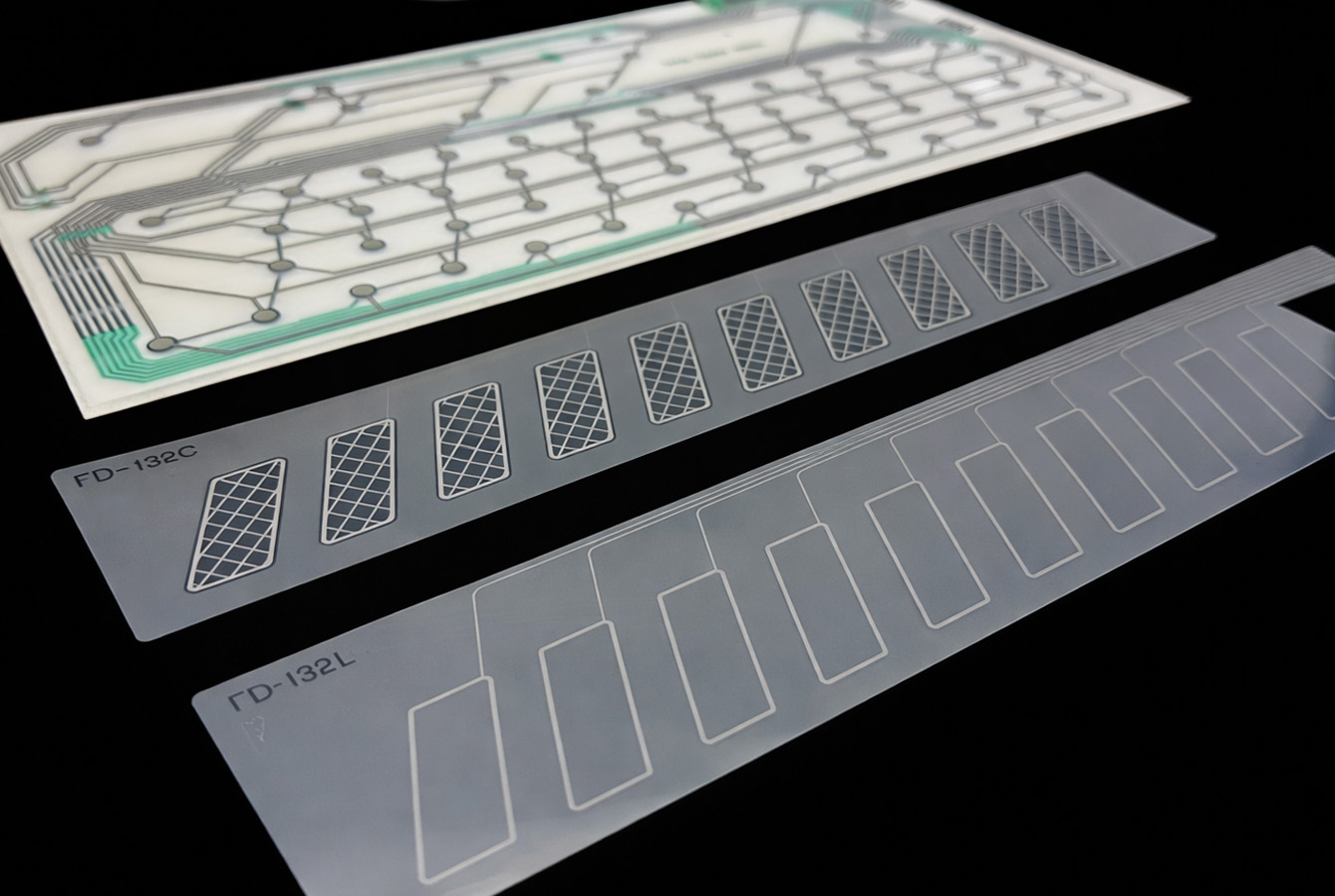 銀・カーボン等の導電インクや圧電インクを使い、フィルムに高精度な回路印刷を行い、メンブレンスイッチ、感圧センサー、タッチスイッチ、近接センサー、非接触センサー、液量センサー、金属センサーやヒーター、アンテナ等、医療センサーや産業用機械のスイッチデバイス、特にメカスイッチの置き換えによる薄型・軽量化・防水対応で評価を得ています。